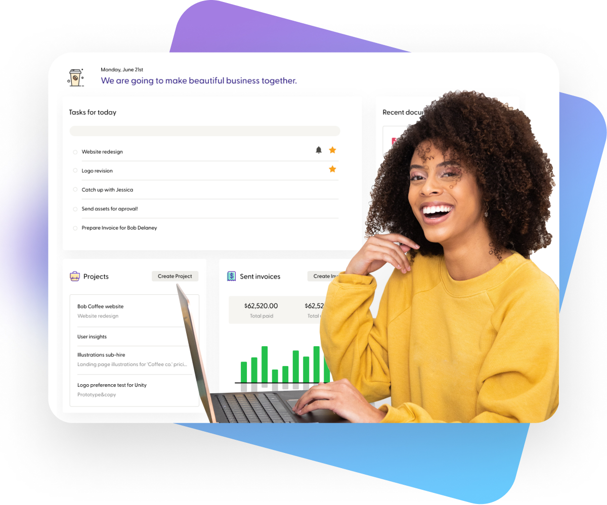 向いている人: コストを抑えて業務ツールを統合したいフリーランス、契約書や提案書の作成を効率化したい個人事業主、請求書管理と支払い追跡を自動化したい方、複数のプロジェクトを同時管理するクリエイター。