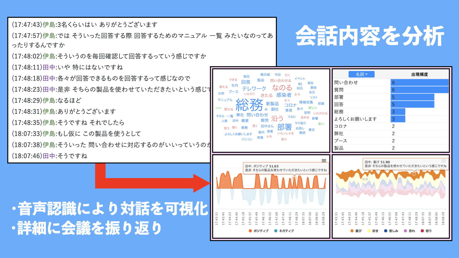 特定のプロジェクト名や製品名がどの程度言及されたか、ネガティブな形容詞の出現頻度はどうかなど、データドリブンな会議分析が可能になります。定例会議で毎回この分析を行うことで、議論のトレンドや変化を時系列で追跡するといった活用法も考えられます。